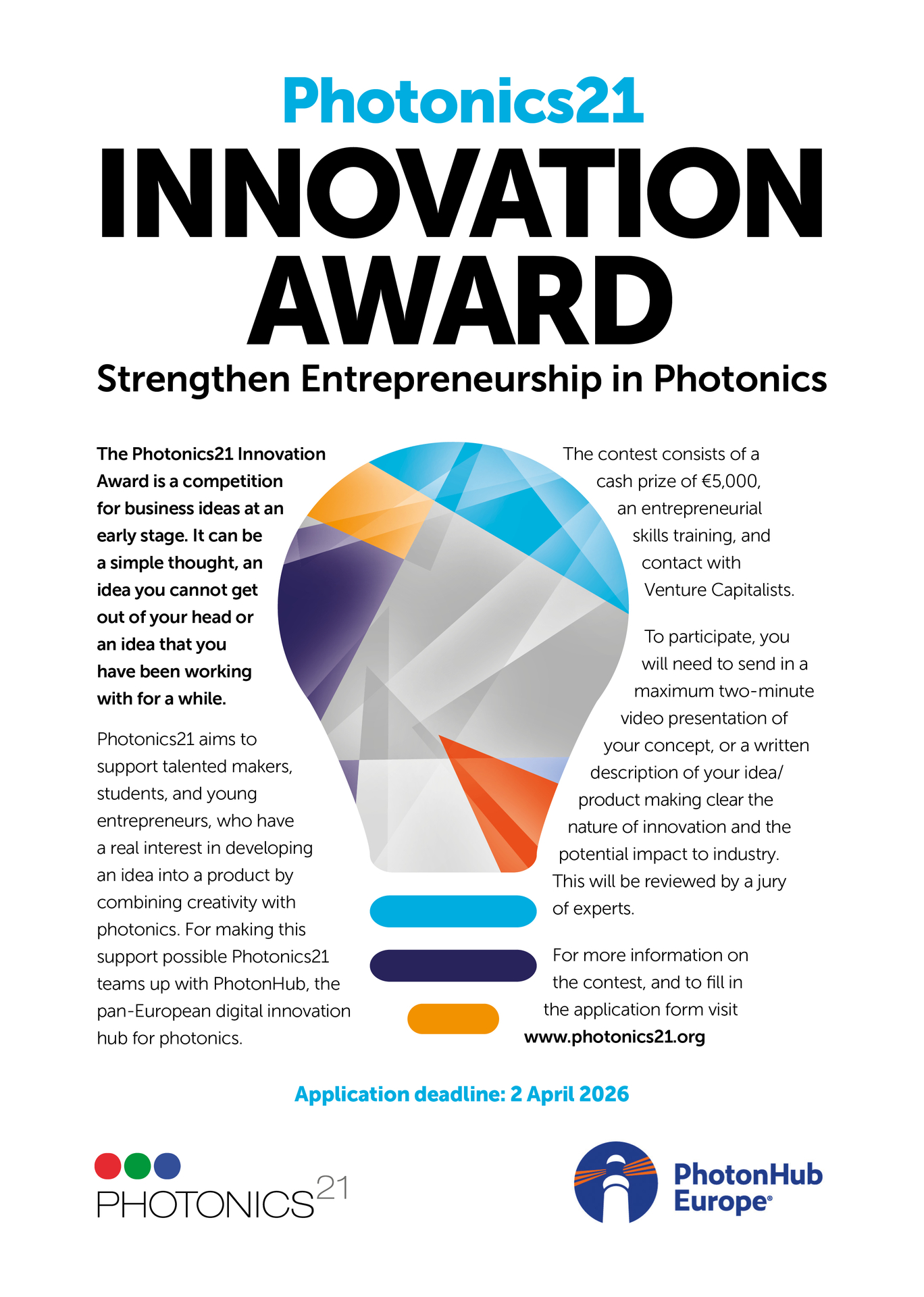 The winner will receive a cash prize of 5000 € as well as an entrepreneurial skills coaching. The second and third winner will equally benefit from an entrepreneurial skills training by PhotonHub Europe.
