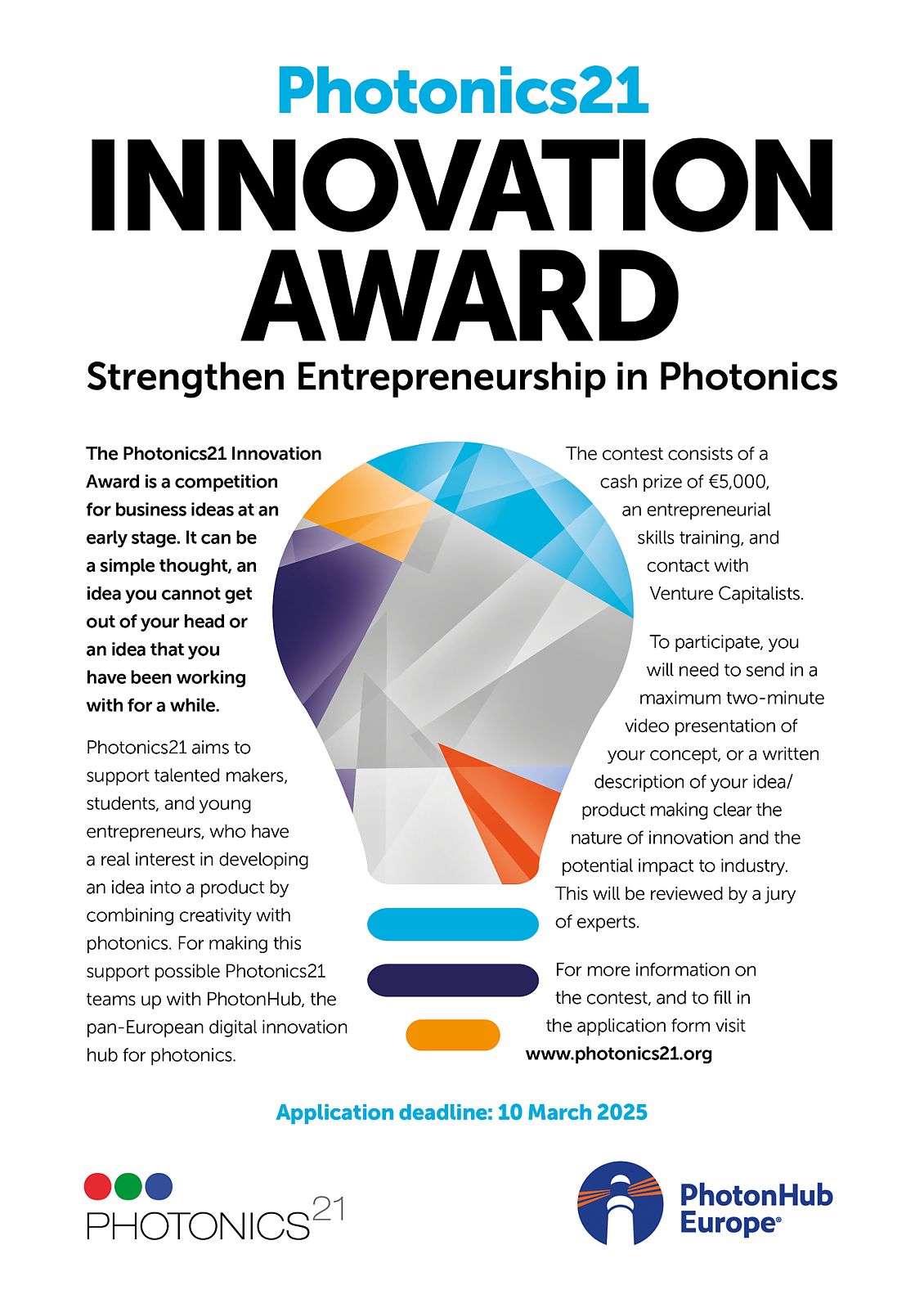 Please send your application to the Photonics21 Secretariat by the closing date of 10th March 2025 at 23:59 (CET).