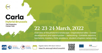 In the framework of the EU-project CARLA, the Photonics Career Hub (https://carlahub.eu/), VUB B-PHOT is organizing CARLA Hybrid Camp Brussels 2022 (22-23-24 March, each time from 4:30 pm to 9:30 pm).